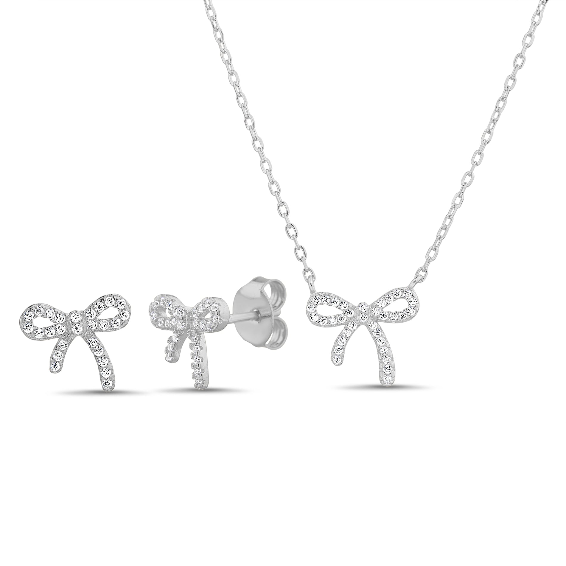 Sterling Silver Rhodium Clear Cz Simulated Diamond Bow & Stud Earrings Set