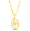Sterling Silver Gold Clear CZ, Mother of Pearl 4 Corner Star on Oval Disc Pendant W/Peperclip Chain Necklace