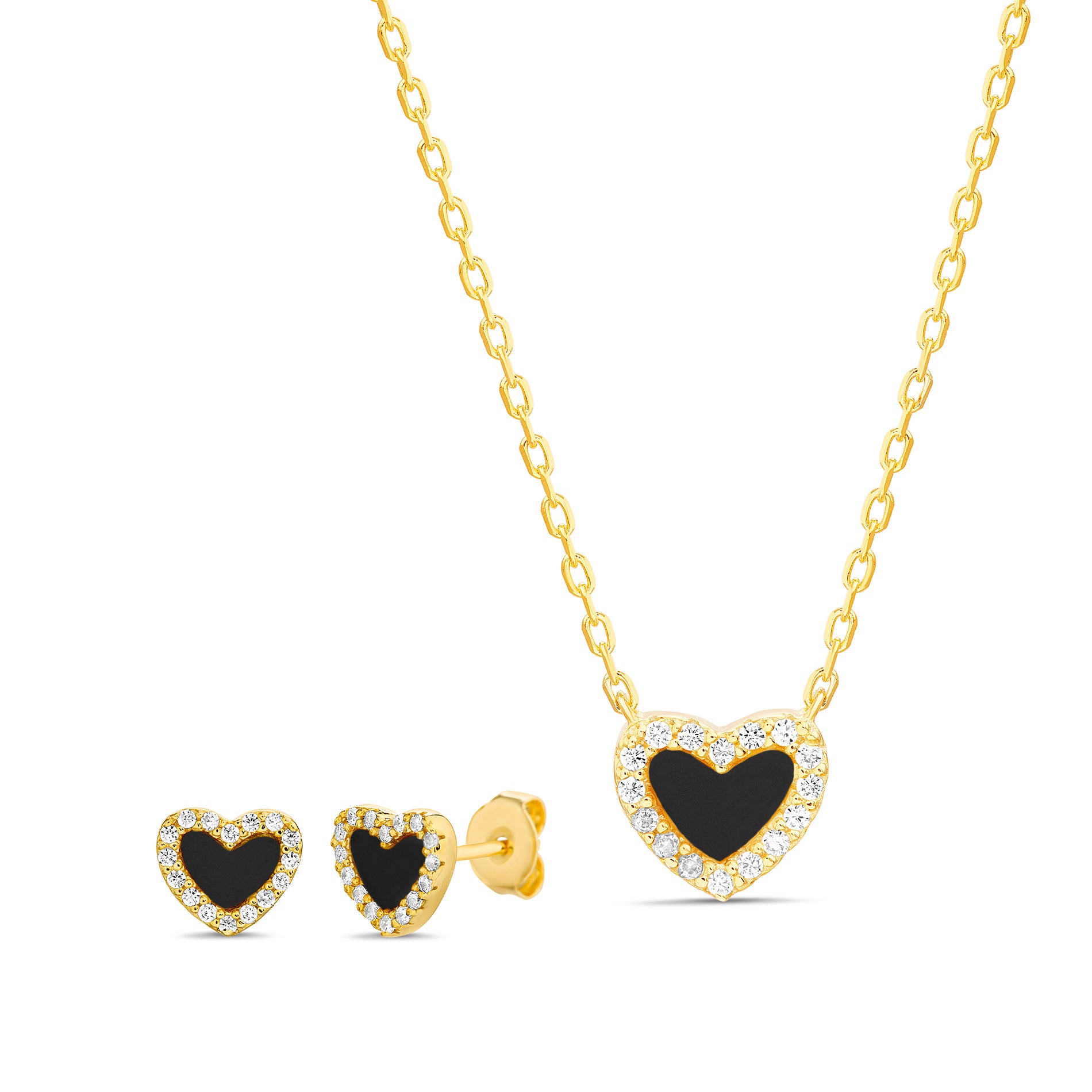 Sterling Silver Gold CZ Black Heart Pendant Station on Paperclip Chain Necklace & Earring Set