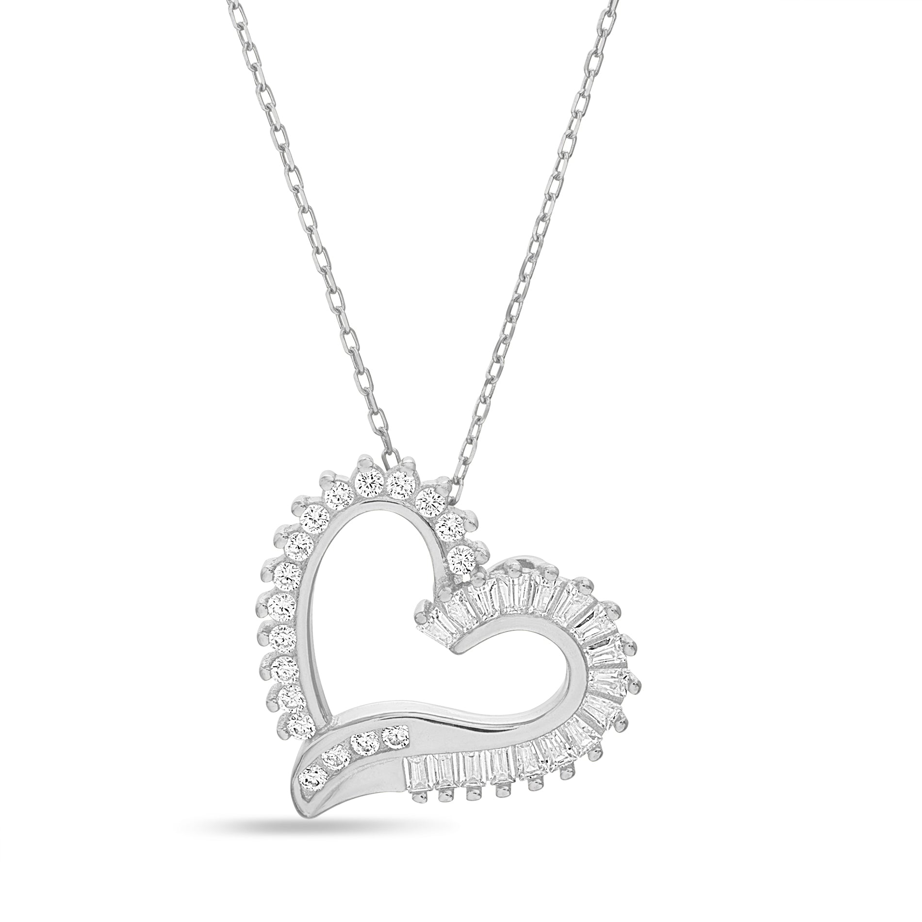 Sterling Silver Rhodium CZ Baguette Open Heart Chain Necklace