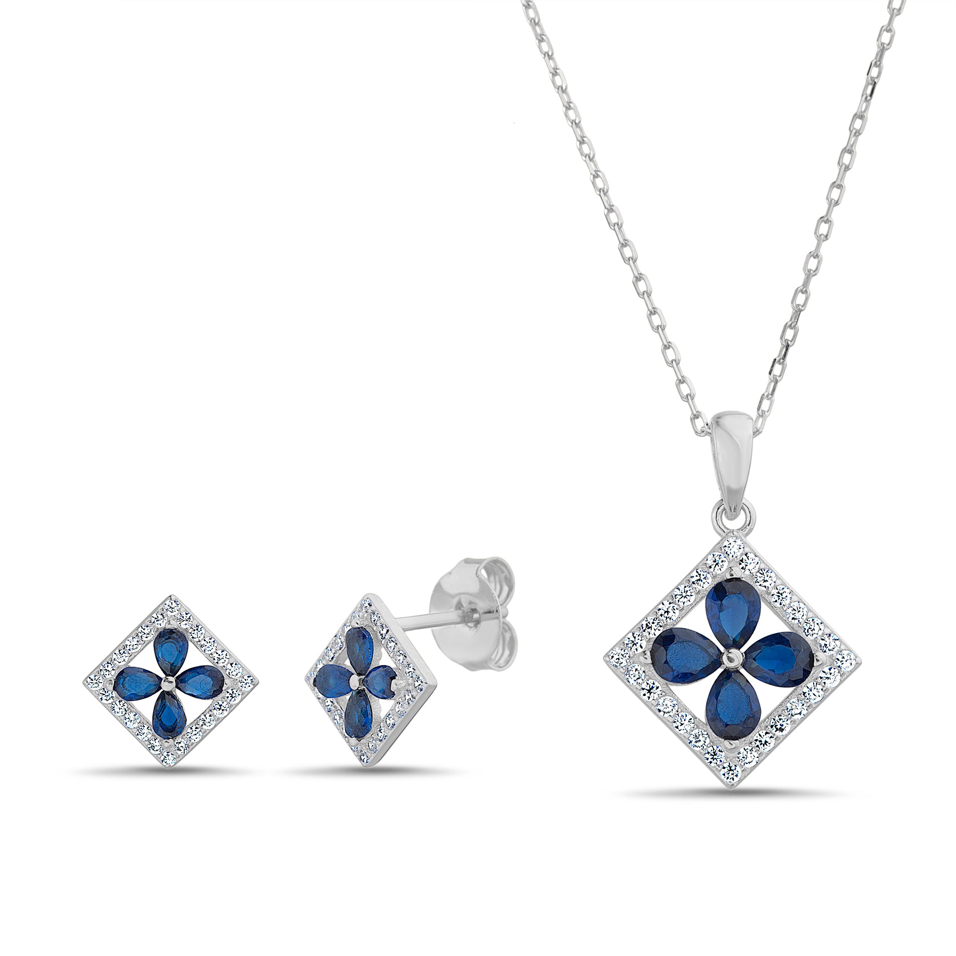 Sapphire Diamond Shape with Center Flower Earring & Necklace Set