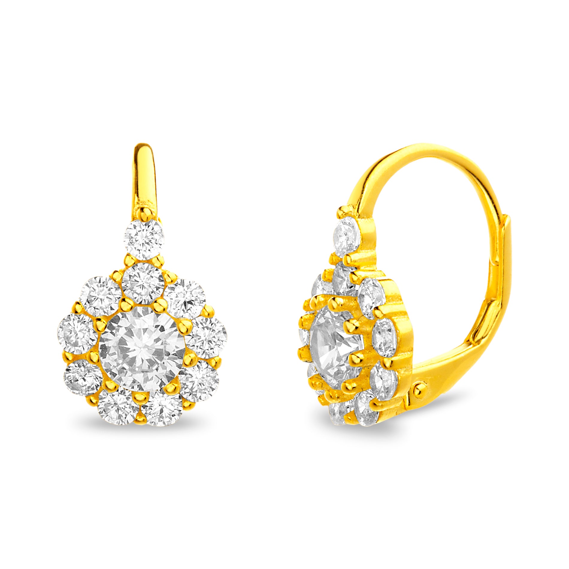 Gold CZ Flower Leverback Earrings