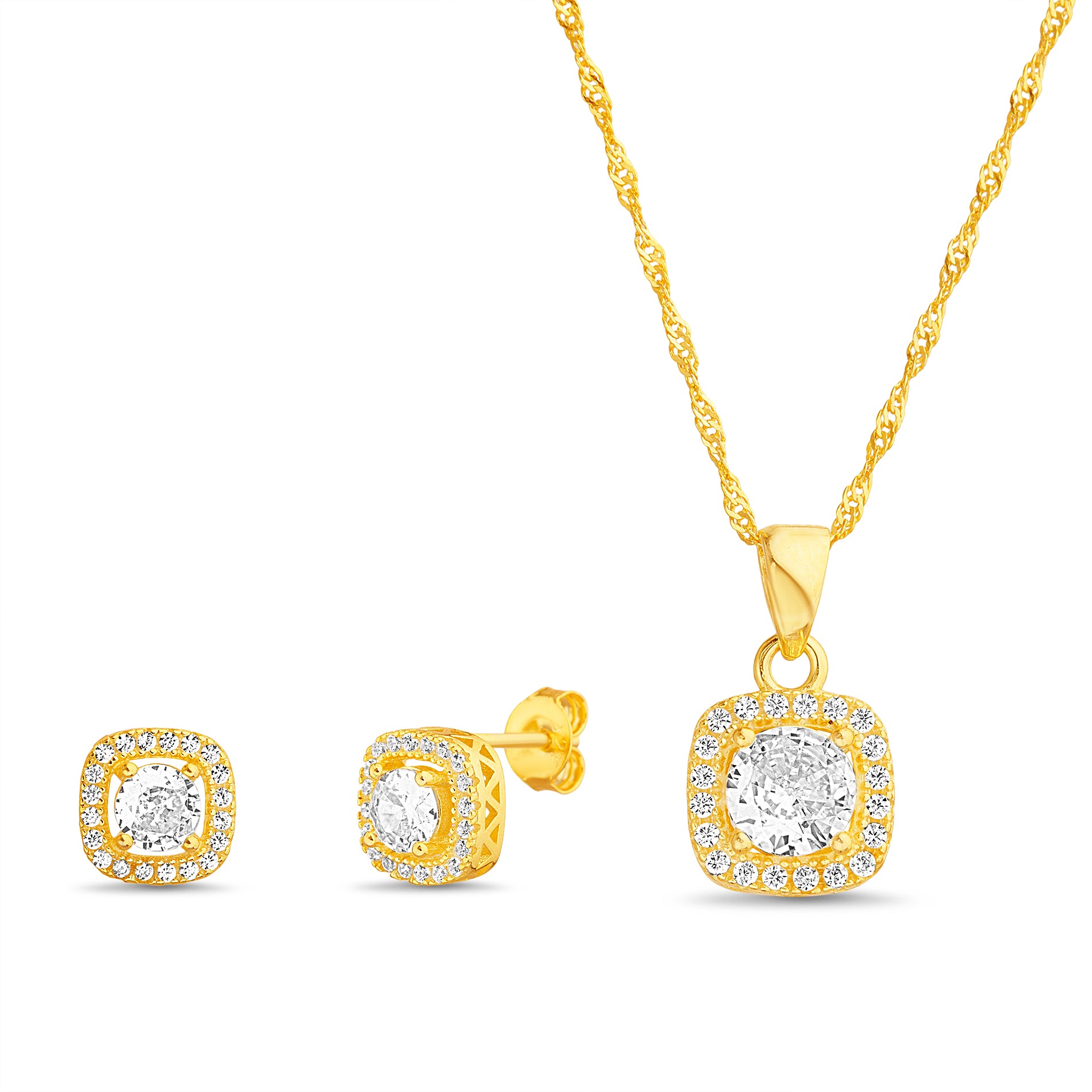Gold Clear CZ Square with Halo Earring & Necklace Set
