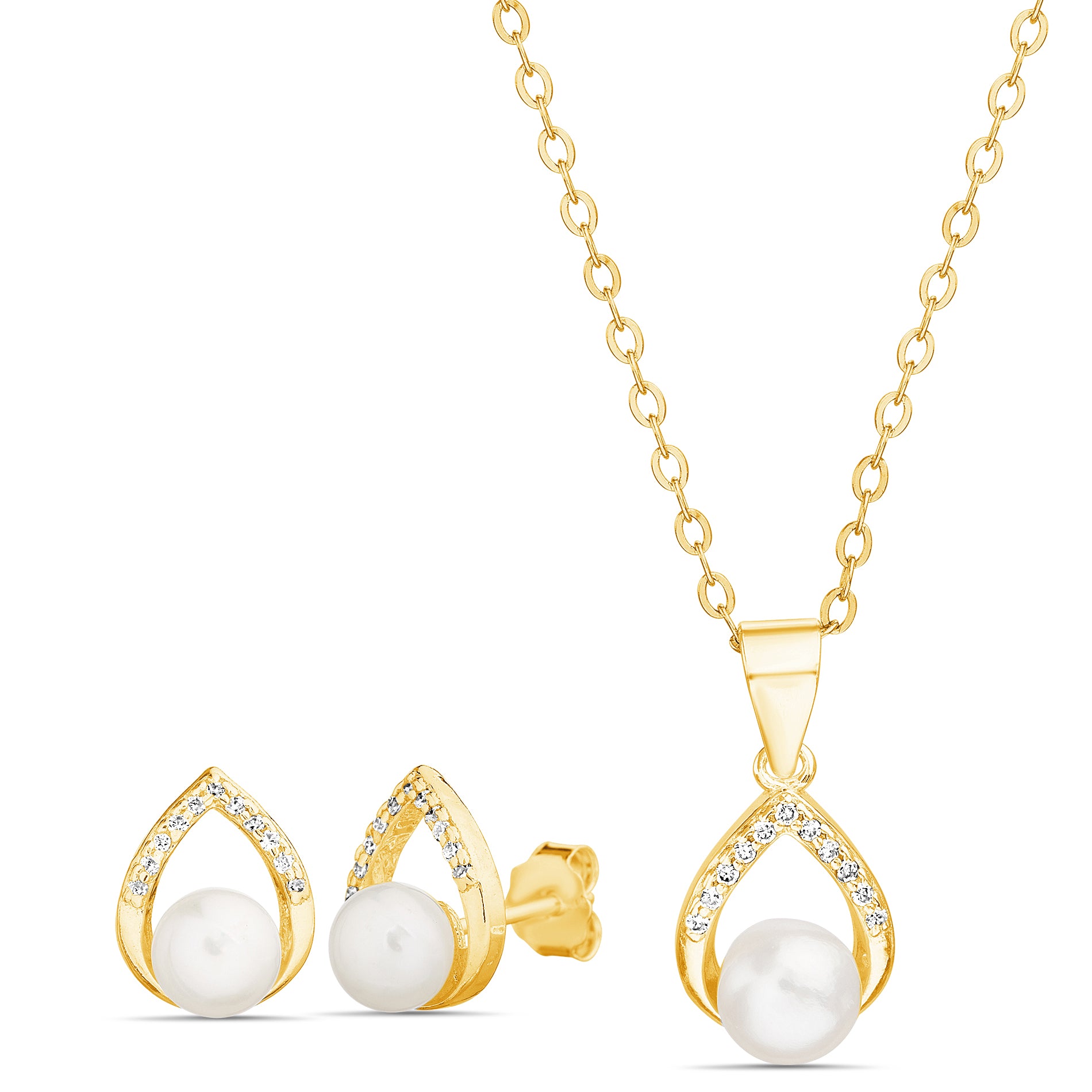 Gold Pearl & Clear CZ Earring & Necklace Set