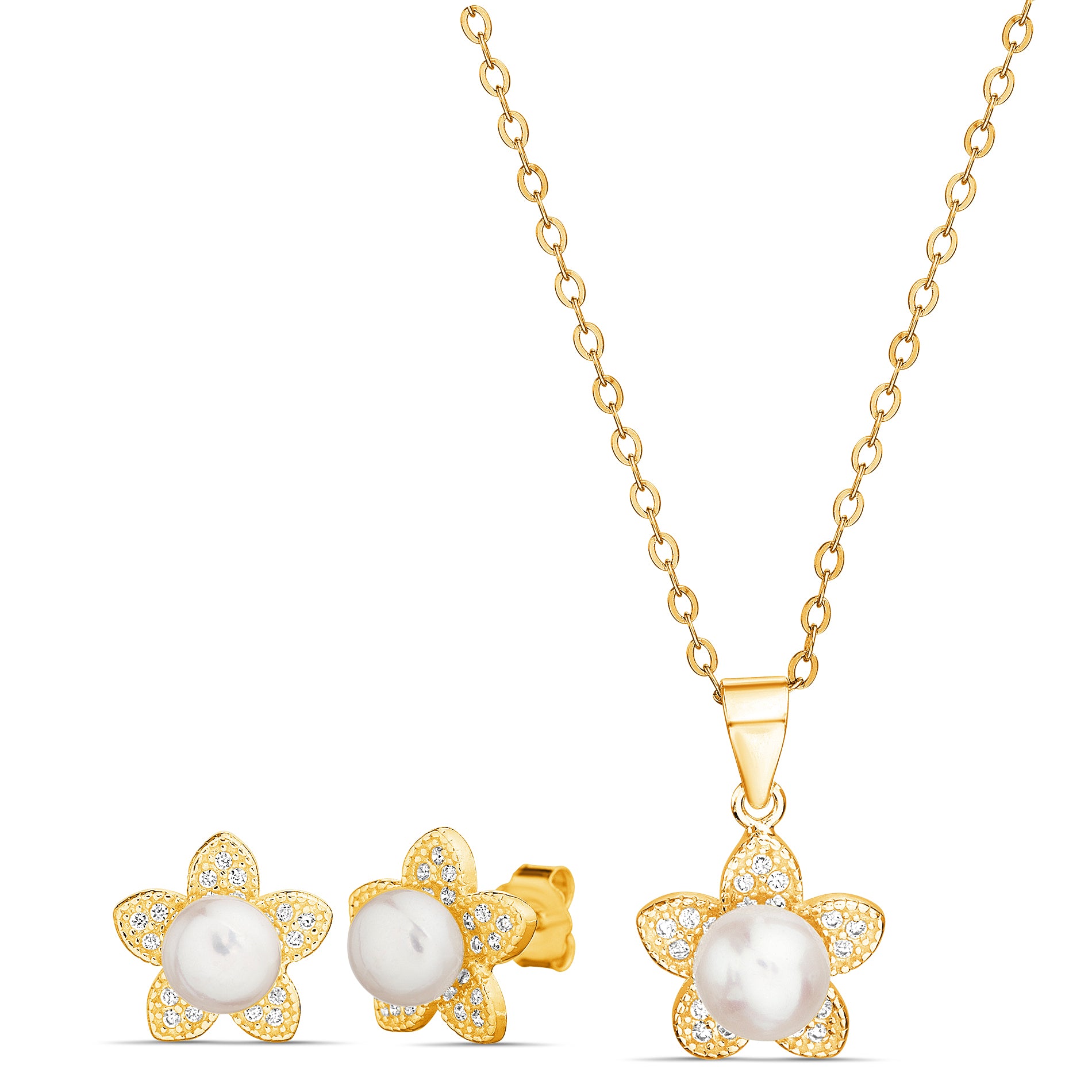Gold Pearl & Clear CZ Flower Earring & Necklace Set