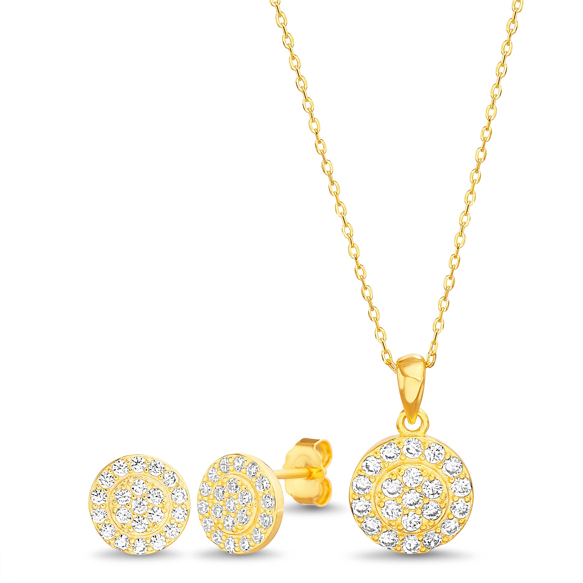 Gold Clear CZ Pave Round Disc Earring & Necklace Set