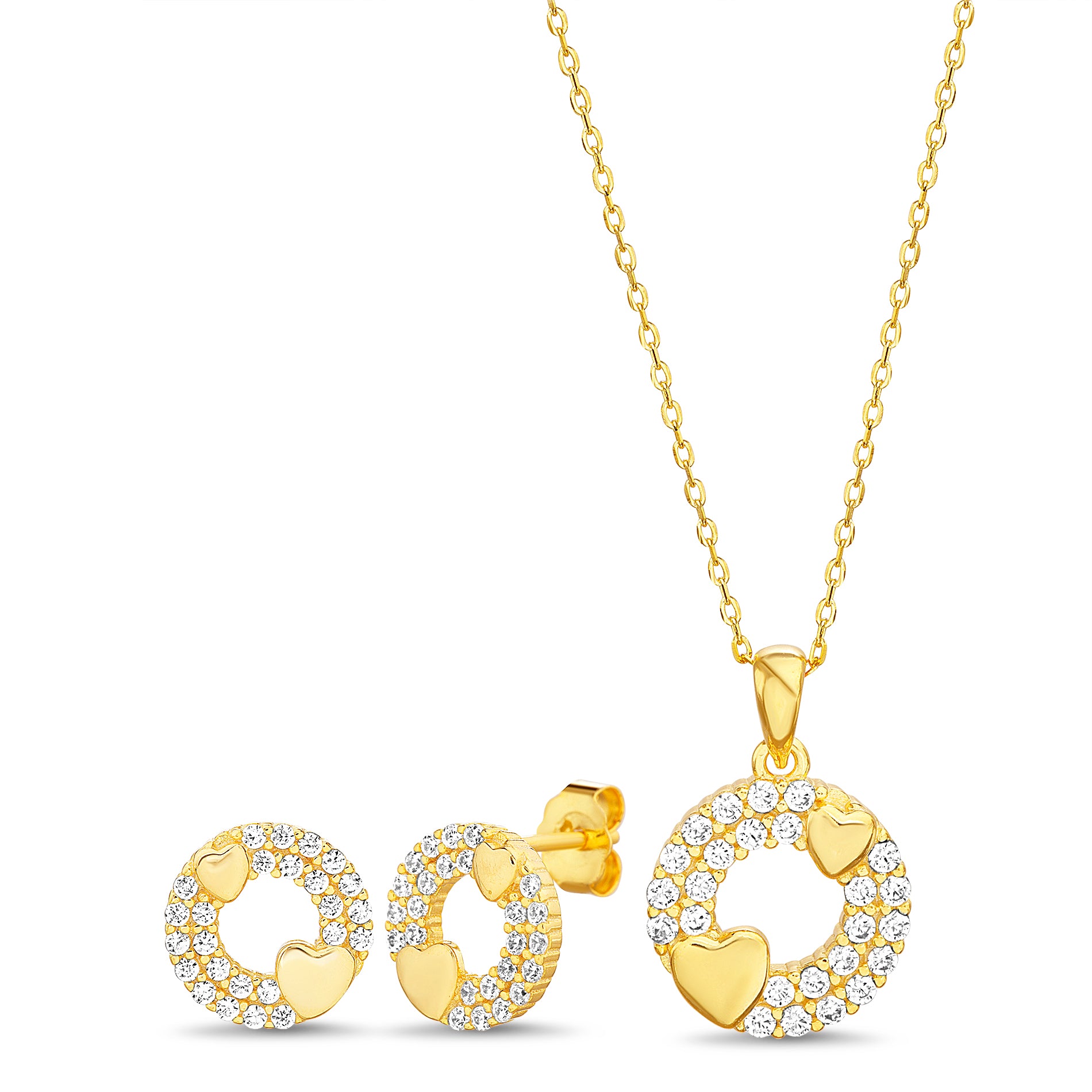 Gold Clear CZ Heart with Open Disc Earring & Necklace Set