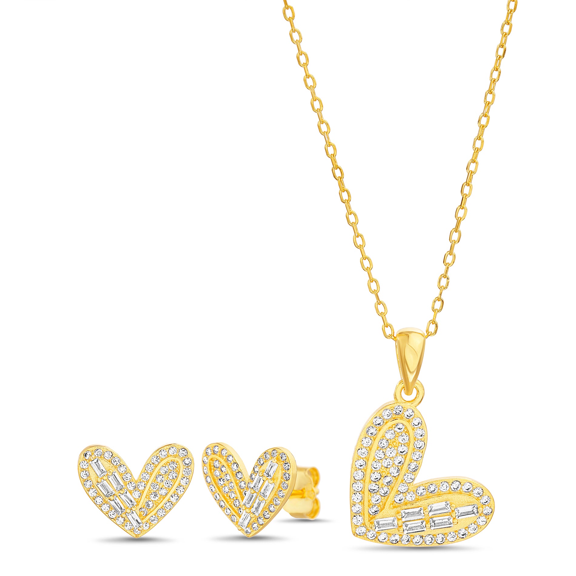 Gold Clear CZ Sided Heart Earring & Necklace Set