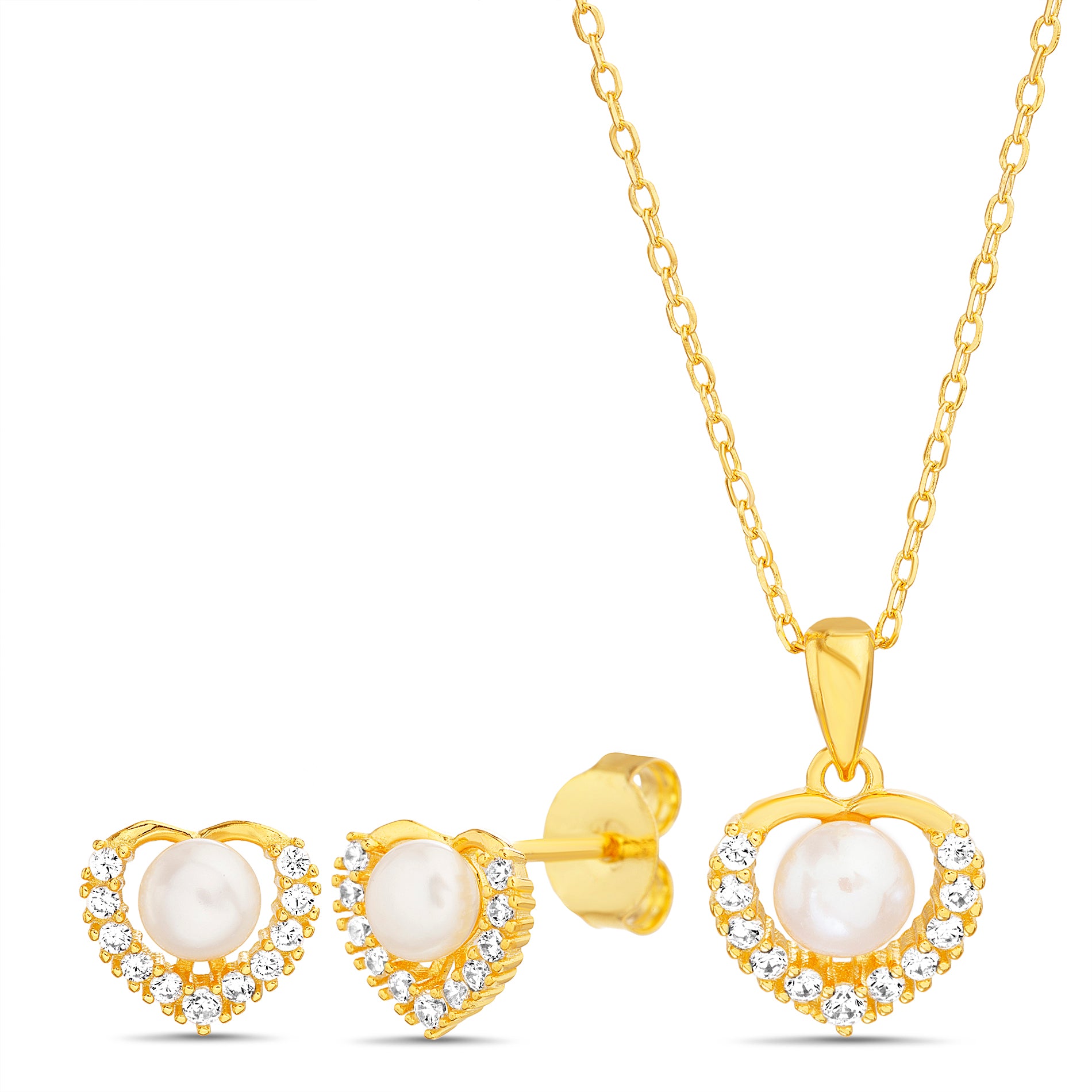 Gold Pearl & Clear CZ Heart Earring & Necklace Set