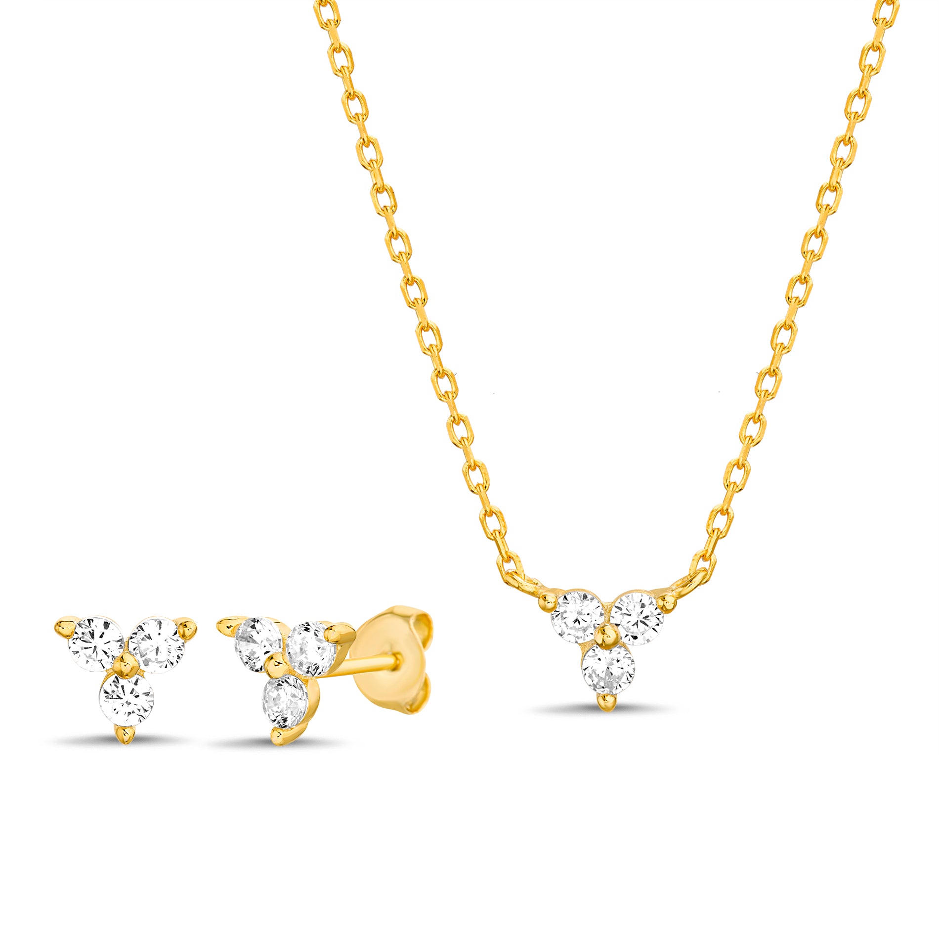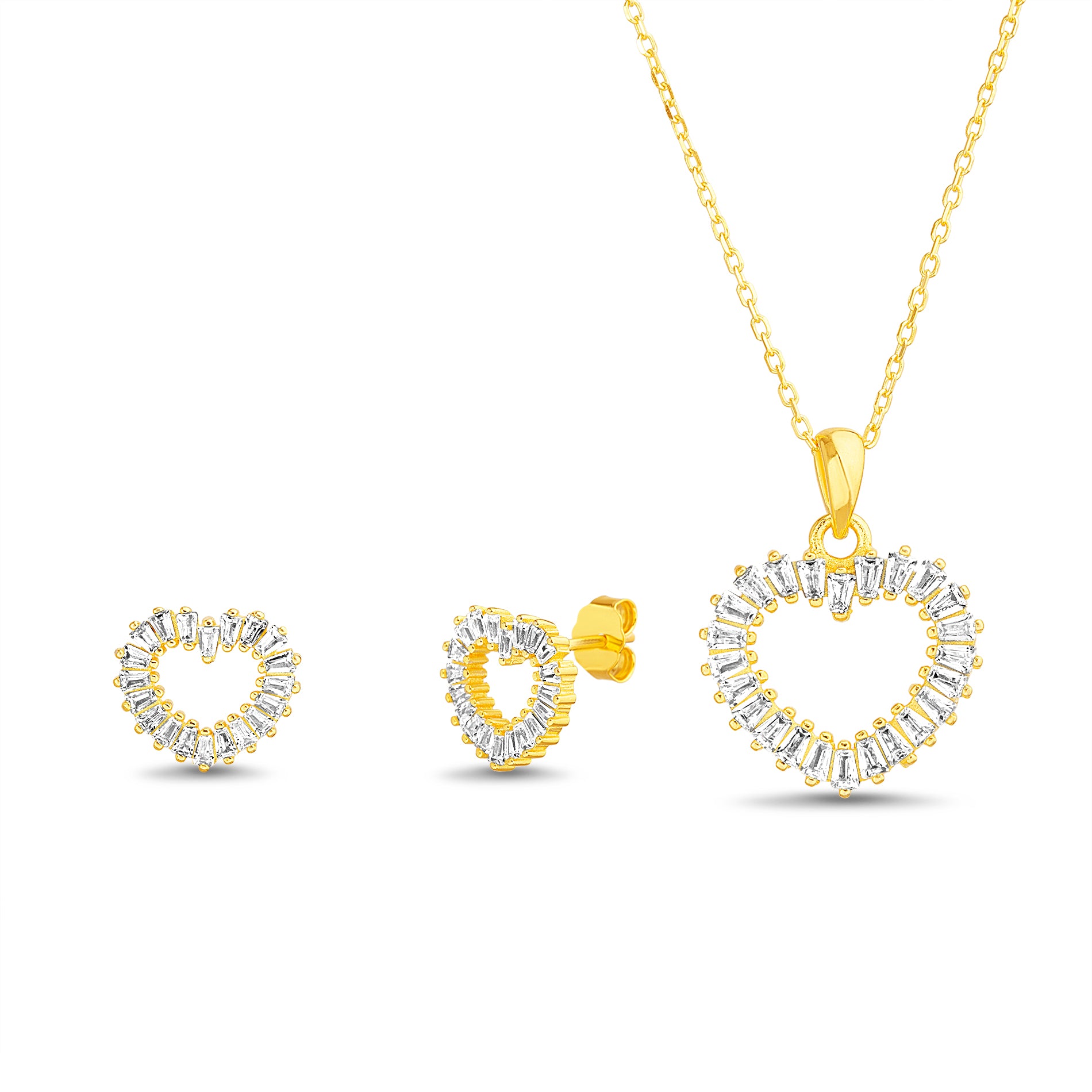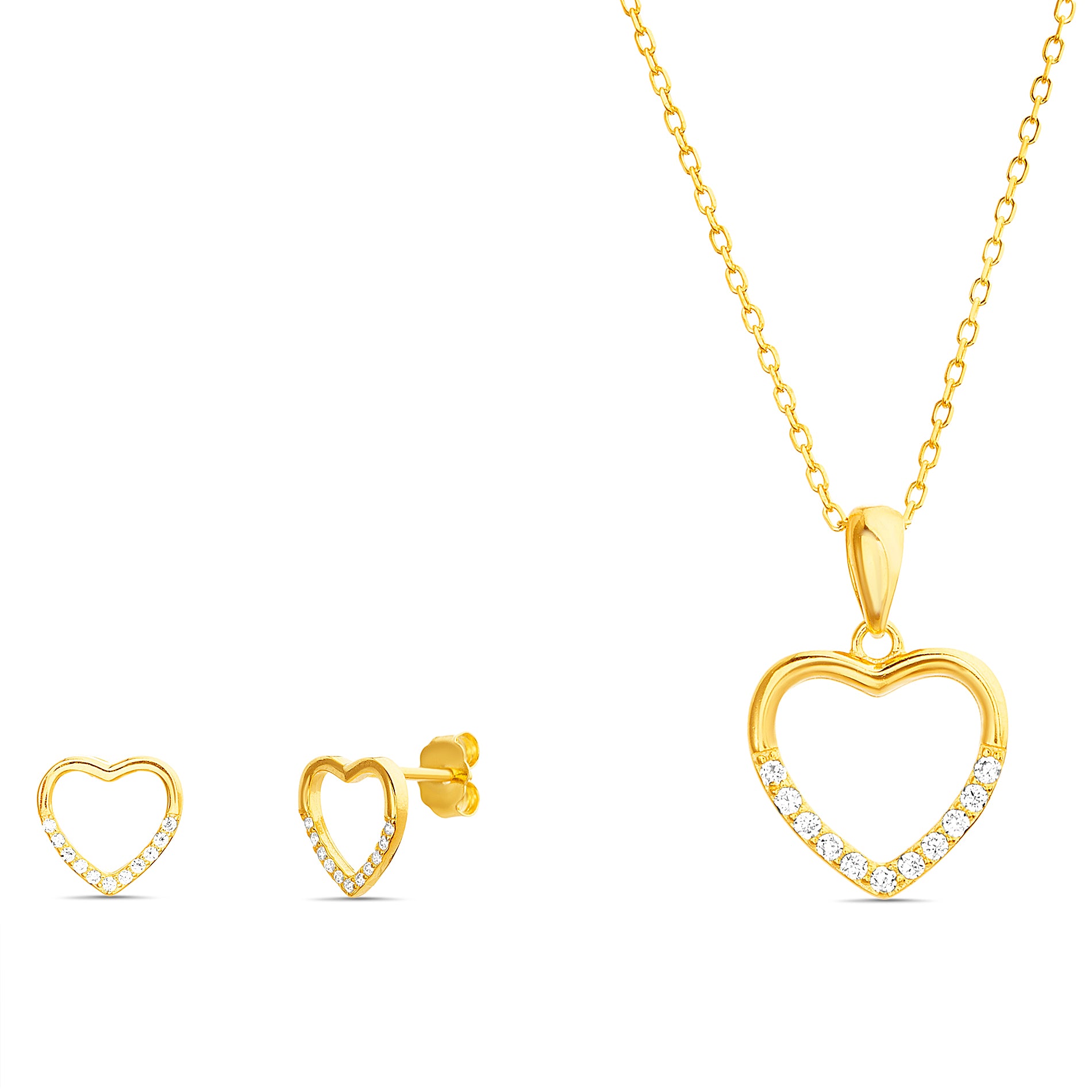 Gold Clear CZ Polished Open Heart Earrings and Necklace Set