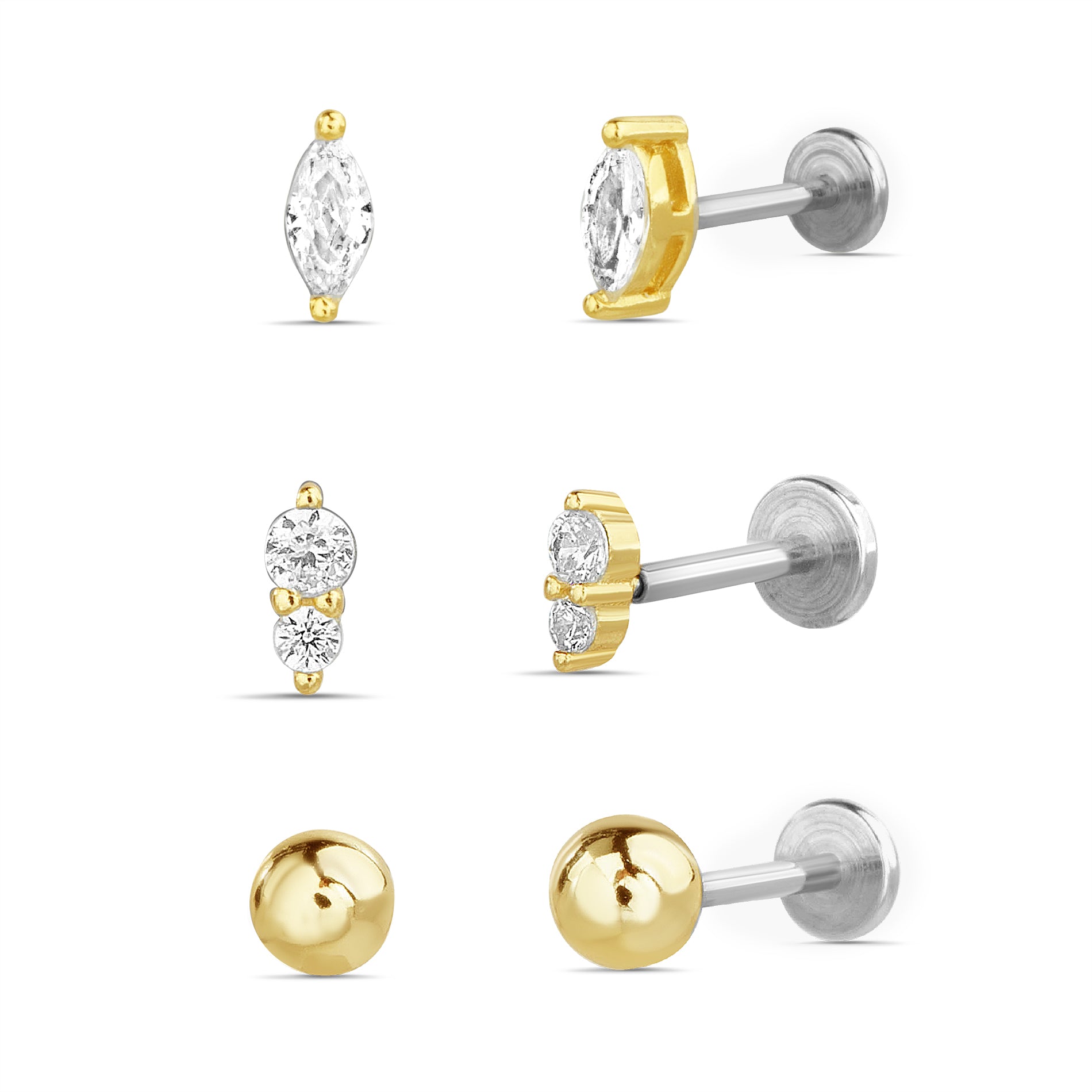 Gold Comfort Earring Set - CZ Double Round, Marquise, & Ball