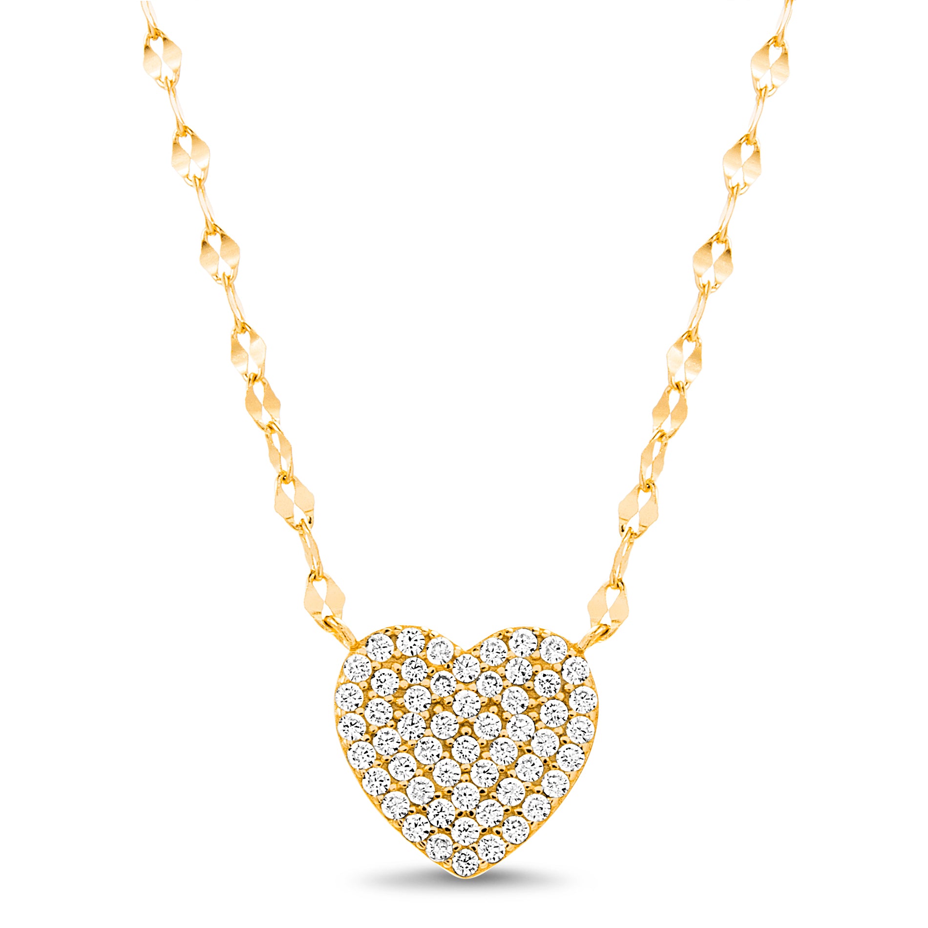 Sterling Silver Gold Clear CZ Pave Heart Station on 16" + 2" Cable Chain Necklace